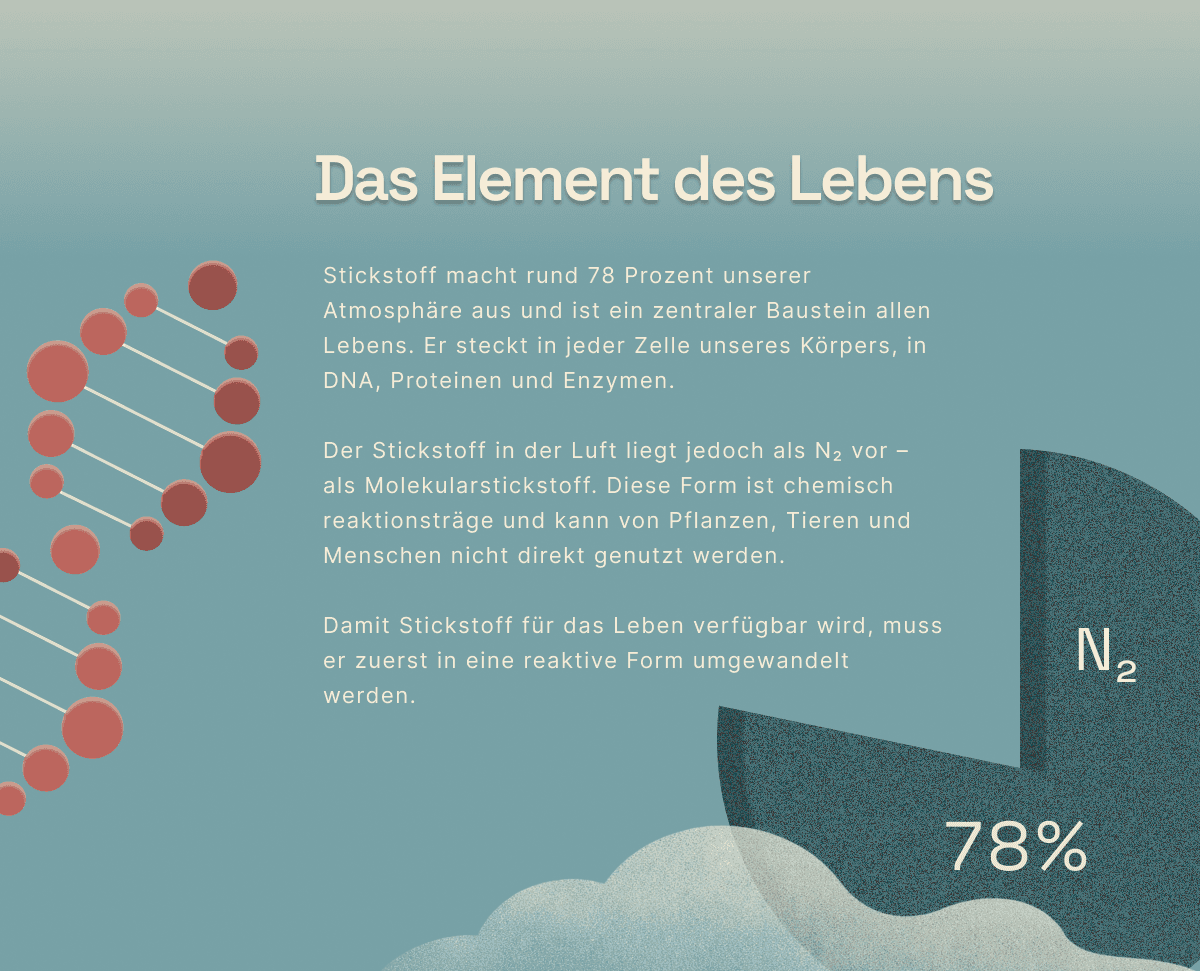 Doch ausgerechnet der Stickstoff in der Luft ist chemisch träge und für Lebewesen nicht direkt nutzbar. Erst wenn er in eine verwertbare, reaktive Form umgewandelt wird, kann er genutzt werden.