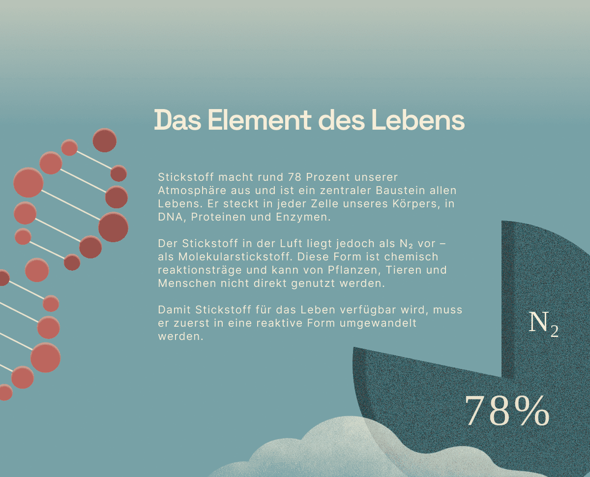 In der Luft, im Boden, in uns. Er ist das häufigste Element unserer Atmosphäre und ein zentraler Baustein des Lebens. Menschen, Tiere und Pflanzen brauchen Stickstoff für grundlegende biologische Prozesse – etwa für die Bildung von Proteinen.